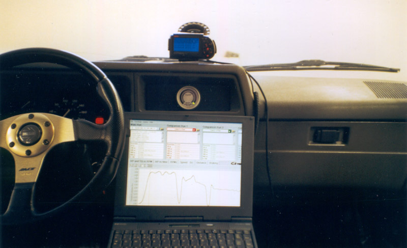 G-tech suorituskykymittari lasissa kiinni imukupilla. Mittaus perustuu kolmiakseliseen g-voimamittaukseen, josta suoritusarvot lasketaan. Tiedot voi purkaa tietokoneelle, jonka näytöltä tuloksia on helpompi analysoida. Kuvassa näkyy g-voima kiihdytyksen aikana ykköseltä kolmoselle asti. Moottorina oli vakiokuntoinen Gsi:n 1,6 8v (C16SEI) ja alustana Weitec Ultra TX -60mm, renkaat 195/45/15. Maksimikiihtyvyys 0,55g, 0-100km/h 8,4s, 0-400m 15,6s kahden hengen kuormalla. Tulokset ovat todennäköisesti aavistuksen verran liian hyviä, koska mittari ei huomioi alustan joustoja. Todelliset arvot voisivat olla esim. 8,7s ja 16,0s.