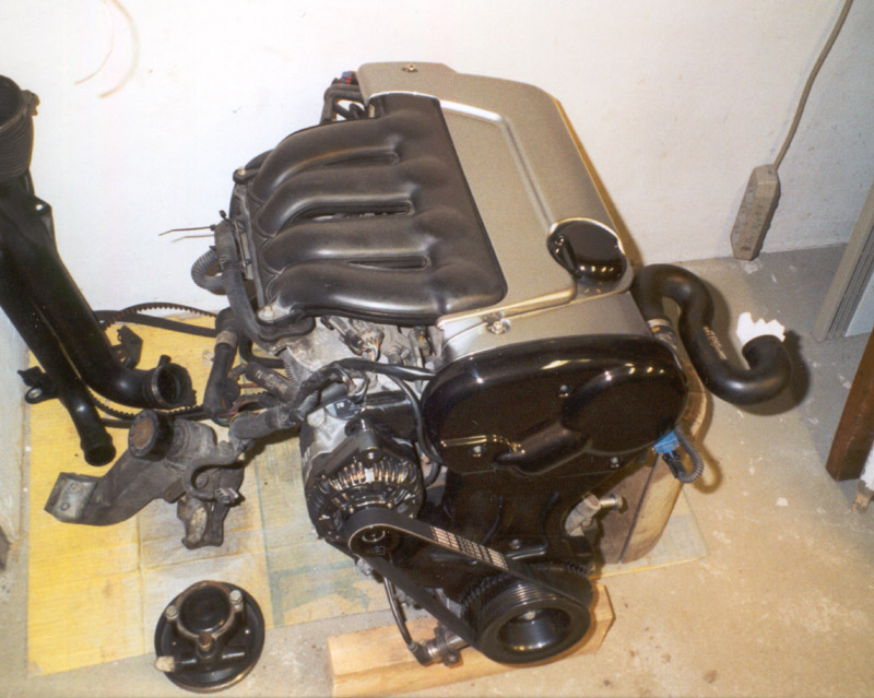 Moottorin koppa maalattiin grafiitinharmaaksi ja jakohihnan koppa ja öljykorkki metallinmustiksi. Imusarjakin olisi tarkoitus maalata metallinmustalla, kunhan kone joskus puretaan. Alahihnapyörä ja laturin runko maalattiin tummemmalla harmaalla. Vasemmalla näkyvä ohjaustehostimen pumppu ja alumiininen moottorinkannake jäävät tarpeettomiksi. Laturinhihnan kiristys muutettiin perinteisen malliseksi aikaisemman kiristinrullan sijaan. Sopivan mittainen hihna löytyi Boschin valikoimista. Konehuoneeseen täytyy tehdä hieman tilaa laturin hihnapyörän kohdalle, ettei se pääse ottamaan runkoon kiinni moottorin keinuessa.